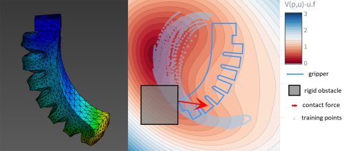 In research for the EU ARISE project, we produced an interactive simulation incorporating a flexible gripper made from hyperelastic materials. Finite-element simulations, which take several minutes, are still a long way from real time. We replaced the gripper’s physical model with a LEBNN trained on a hundred simulations. With an inference time under a tenth of a second, coupling with a real-time contact algorithm is now possible.