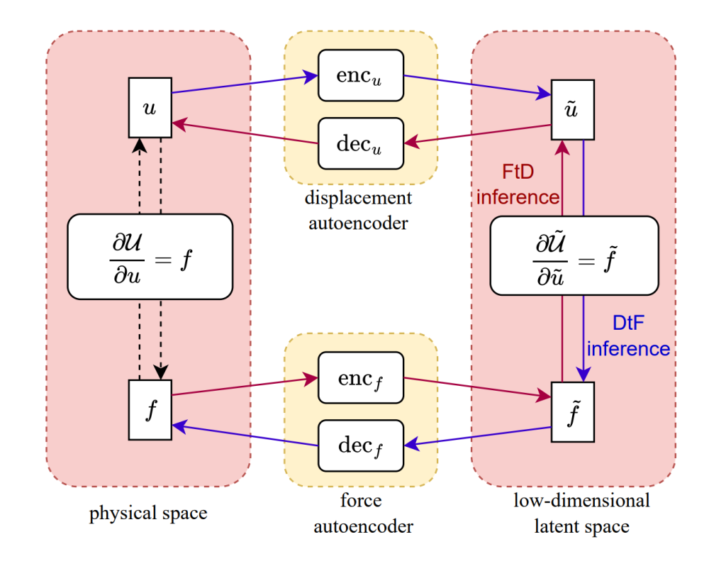The LEBNN architecture, based on the unsupervised learning of a «latent» deformation energy in a low-dimensional space, solves both problems. Structural properties are encoded in latent deformation energy and, specifically, the topology of this latent deformation energy is the same as the structure’s actual deformation energy, which is generally unknown. The structure’s rigidity matrix can be calculated from the Hessian of the latent energy. After it is trained, LEBNN can be integrated into a multi-physics simulation, totally replacing the learned structure’s finite-element model.
