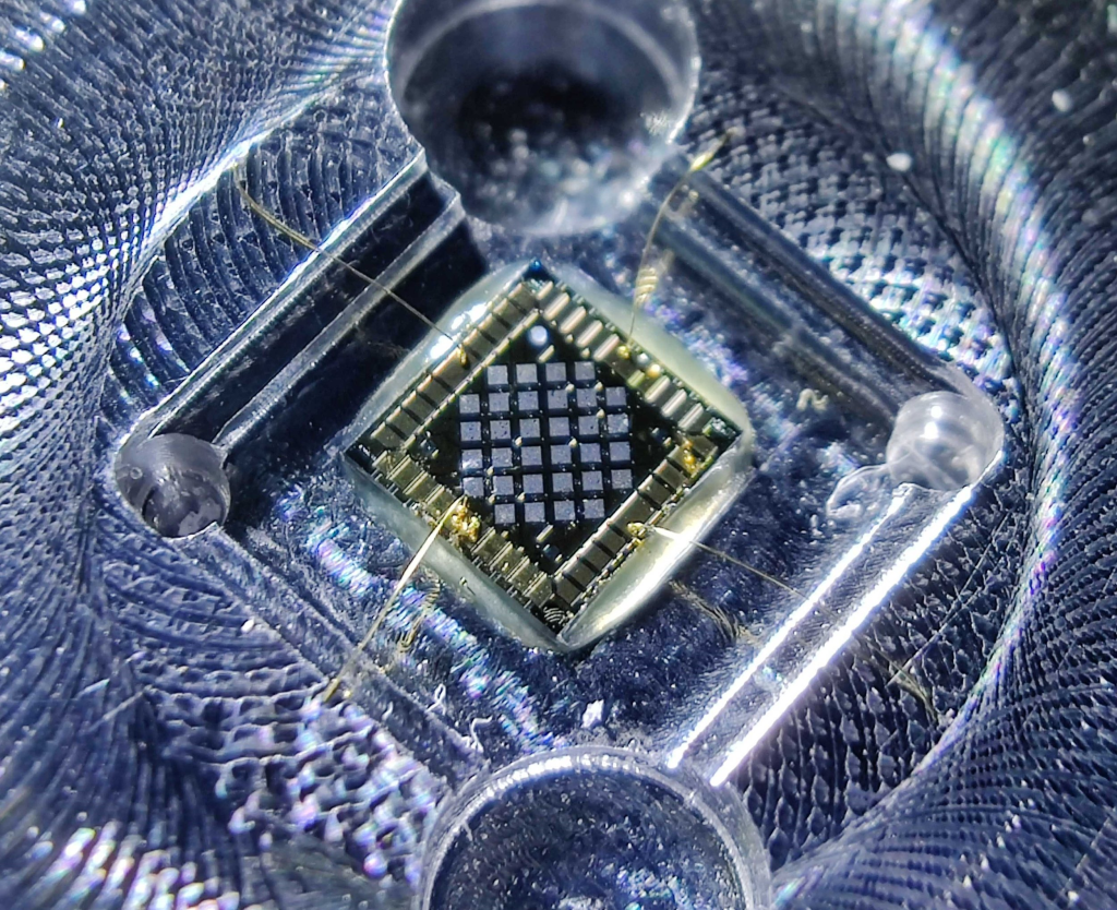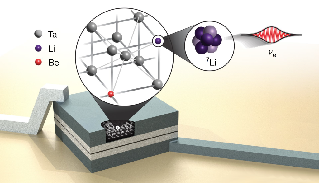 the diameter of a human hair). The radioactive beryllium-7 nucleus, which decays by capturing an atomic electron, is implanted in a superconducting tunnel junction—a quantum sensor with exceptionally high energy resolution. The ultra-precise measurement of the nucleus’ recoil energy—a spectrum of just a hundred electronvolts—provides information about the neutrino emitted, as the two particles are quantum-entangled.