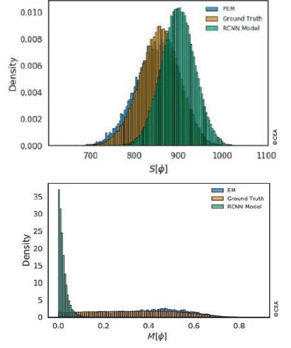 Fig. 2 : Monte Carlo simulation results. Despite the AI models’ excellent performance, significant bias between precise and costly simulation (orange – Ground Truth) and AI-guided simulation (green – RCNN) was observed. The AI-guided simulation can be corrected using the PEM method (blue).