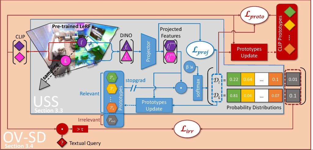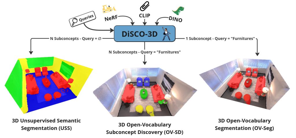 DiSCO-3D est la première méthode capable d’unifier les deux paradigmes, en abordant le problème plus large de la découverte de sous-concepts sémantiques en vocabulaire ouvert (OV-SD). L’approche proposée vise à découvrir les différents sous-concepts sémantiques de la scène 3D pertinents vis-à-vis d’une requête en langage naturel (figure 1).